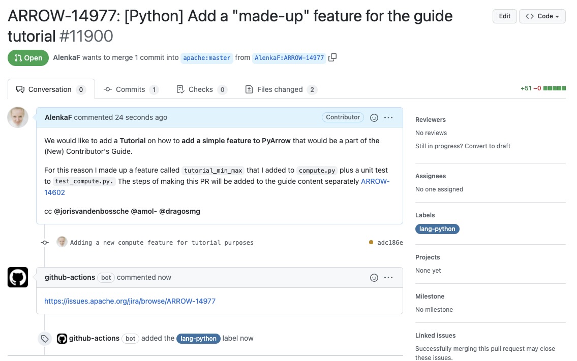 Extra note: when this tutorial was created, we had been using the Jira issue tracker. As we are currently using GitHub issues, the title would be prefixed with GH-14977: [Python] Add a “made-up” feature for the guide tutorial.