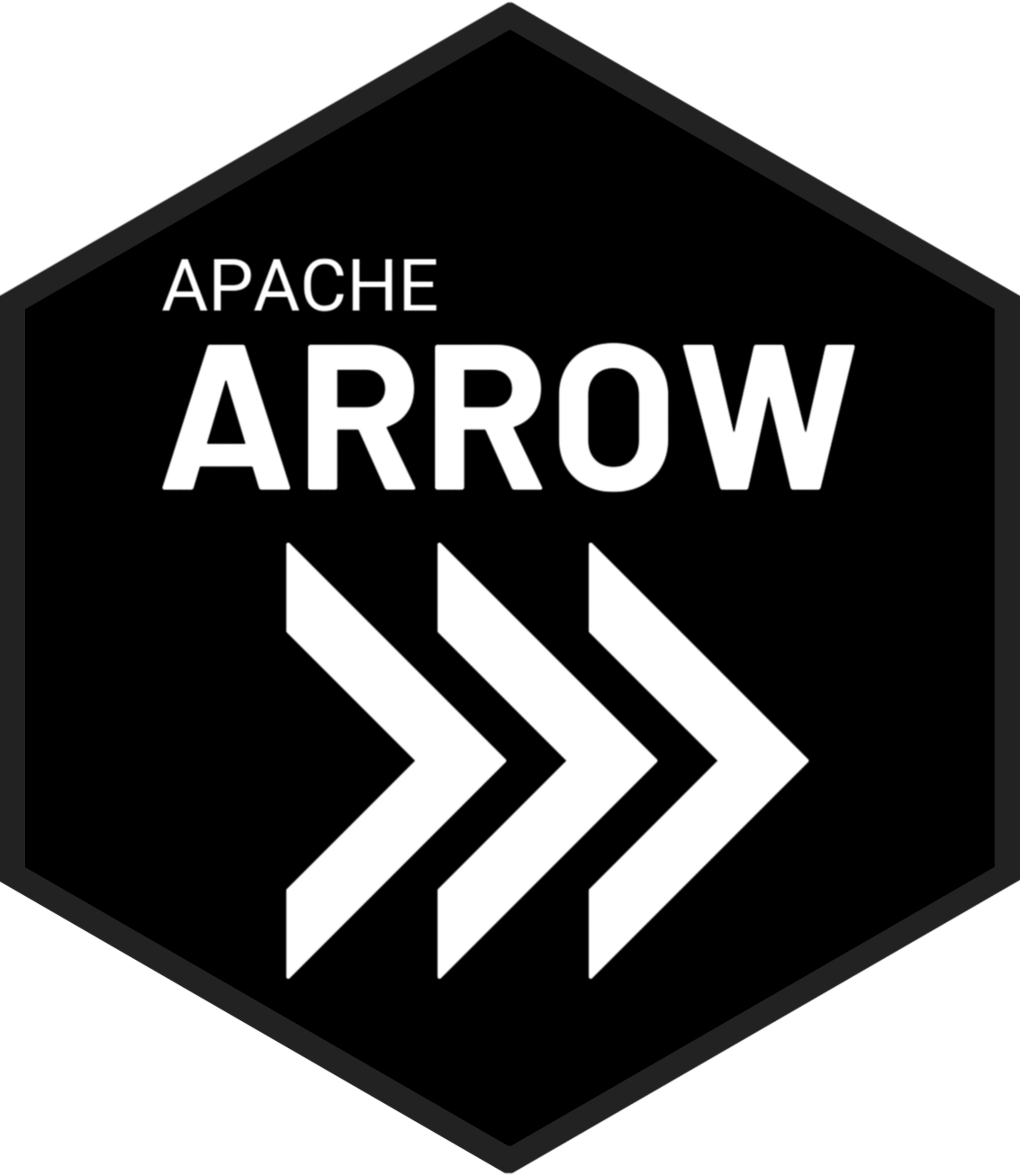The image on the right adds extra orange colored chevrons to the dark themed hex sticker. Again, this is clearly not part of the official Apache Arrow visual identity and should not be presented as such. For this to be appropriate, even informally, the context would need to be one in which the orange elements are meaningfully connected to the surrounding imagery (e.g., perhaps the orange chevrons continue horizontally in either direction) so that the core of the Apache Arrow logo itself remains visually coherent.